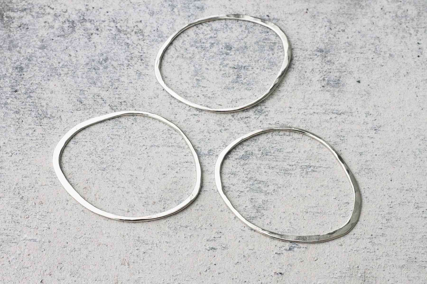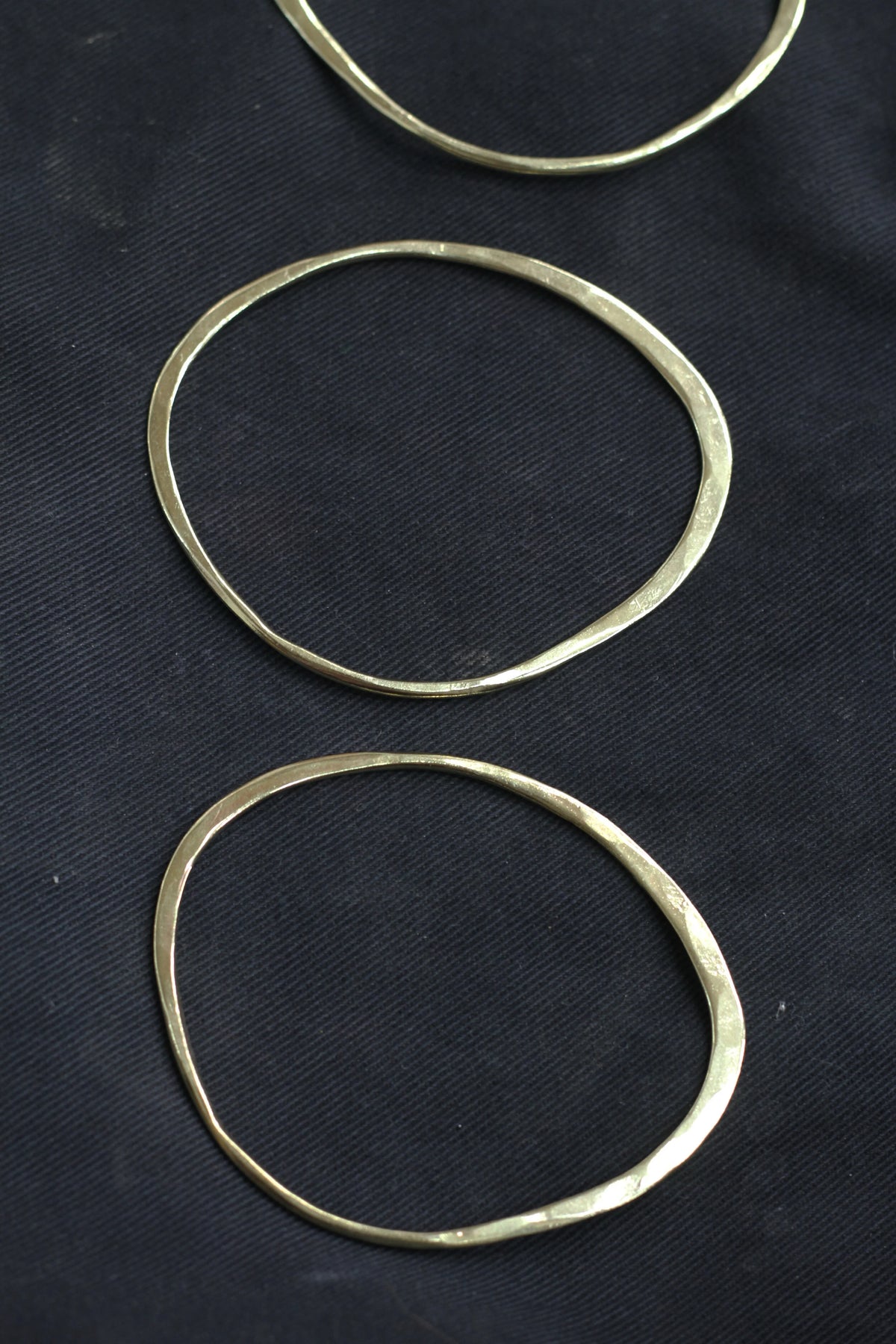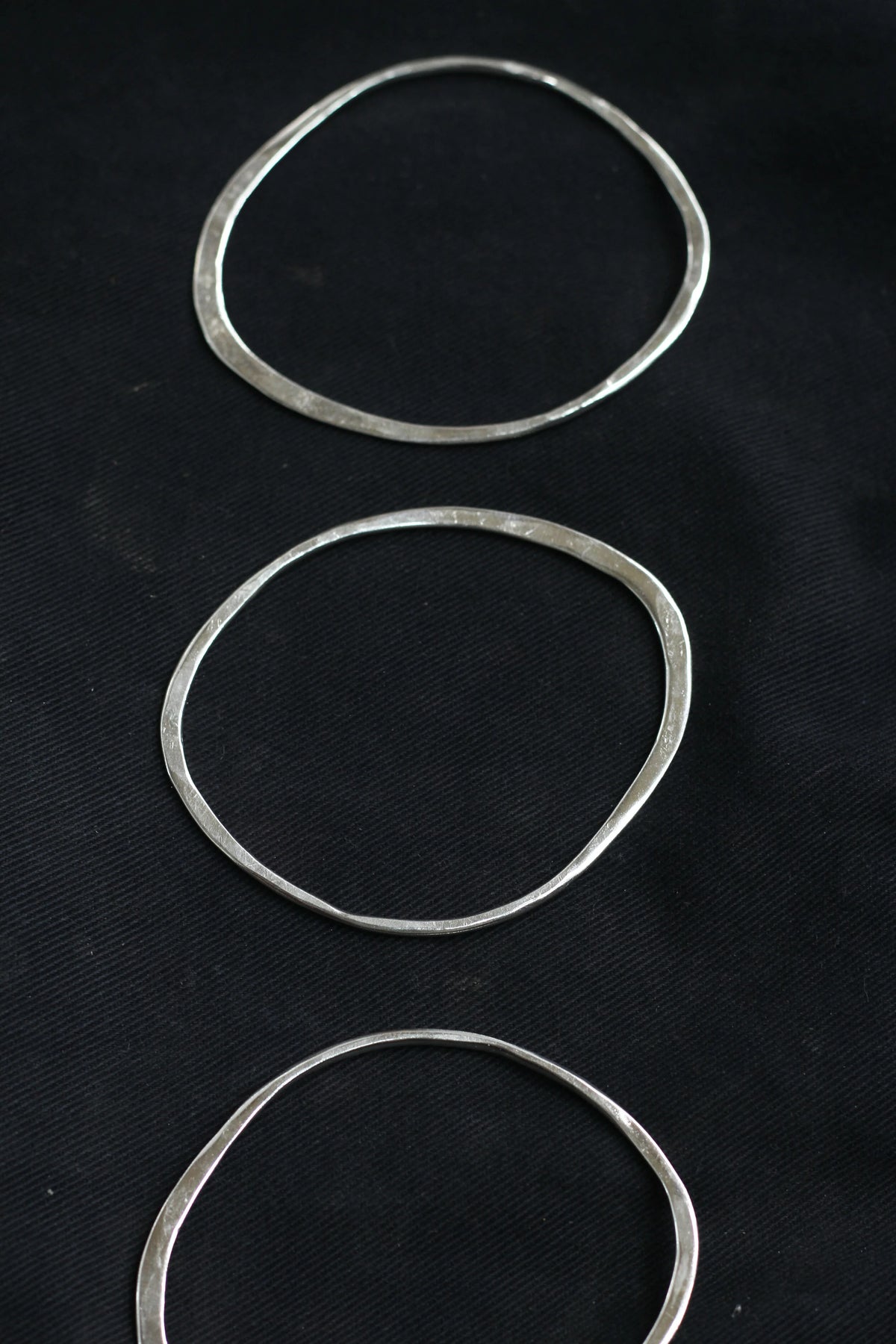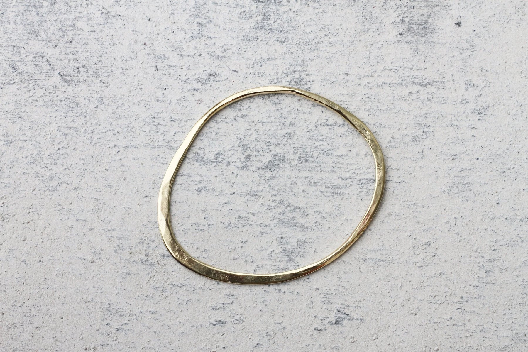 Organically fabricated, hammered, and cast this bangle holds a a slightly oblong and irregular shape. This lightweight bangle is incredibly versatile, accommodates many different sizes, and is easy to glide on and glide off.