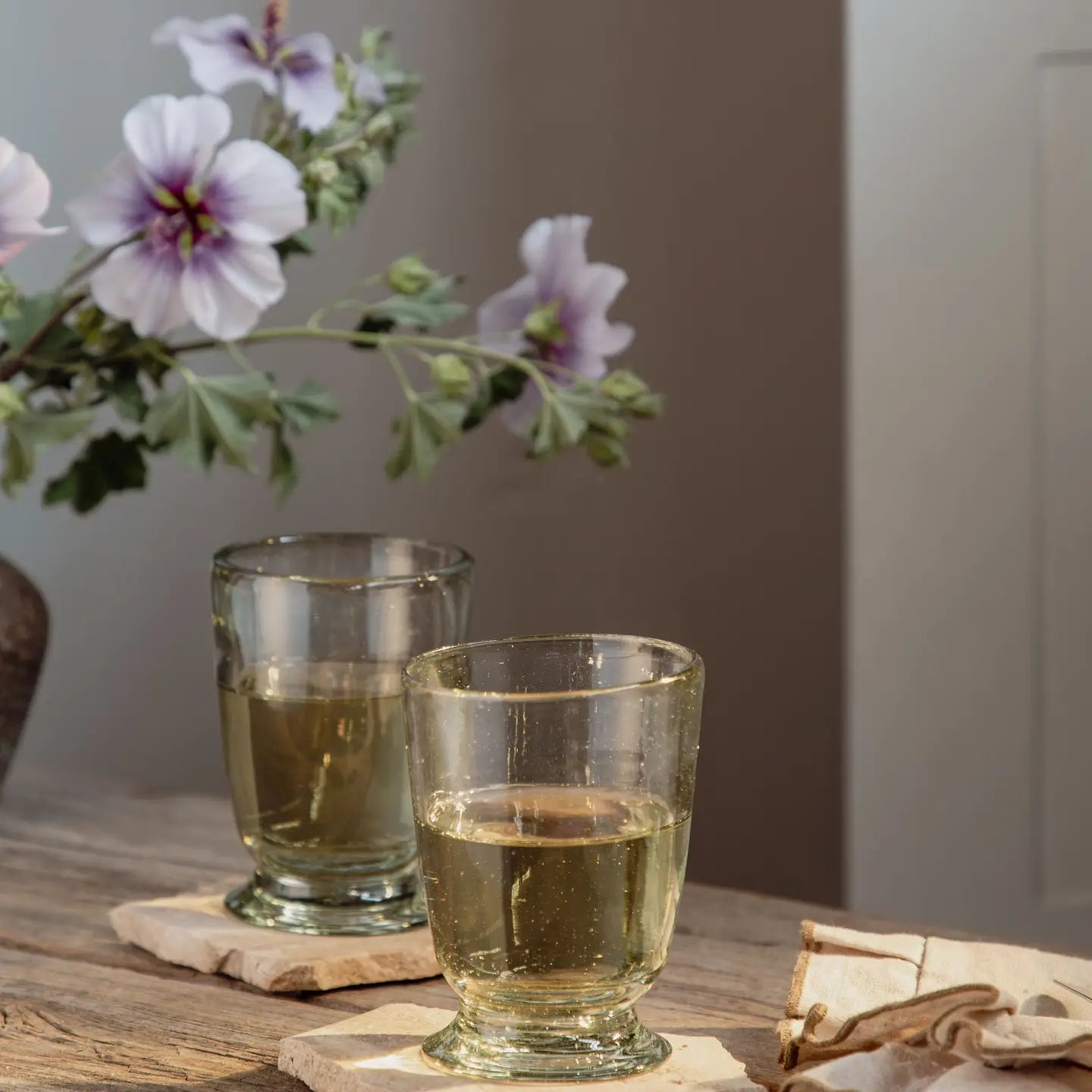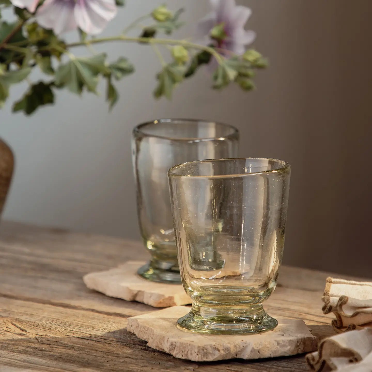 Handblown from recycled glass, these lovely vessels will soon become your new favorite for serving up water, wine, tea and more.