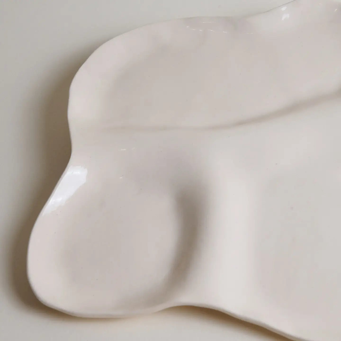 The only vessel to enjoy a true girl dinner. This ceramic Charcuterie board has hand formed wells can hold all of your fave snacks such as fruits, veggies, cheese, crackers, spreads or display your most prized baubles to go on your vanity.