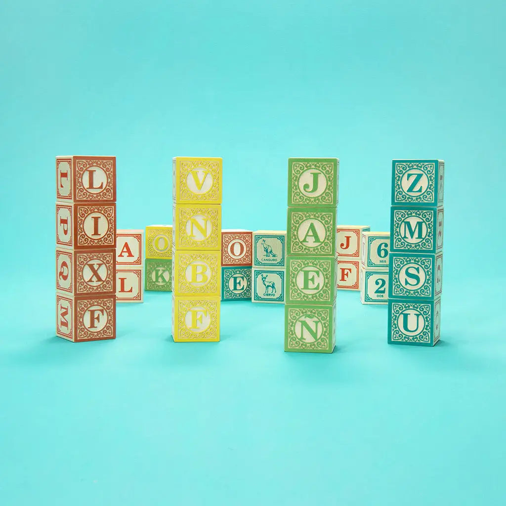Learn the Spanish language. Enjoy the embossed Spanish Corazon design elements that surround two letters on each block. Two other sides reveal one number and one animal paired with their Spanish translations. Two more capital letters make for four complete alphabets in this hand crafted set.