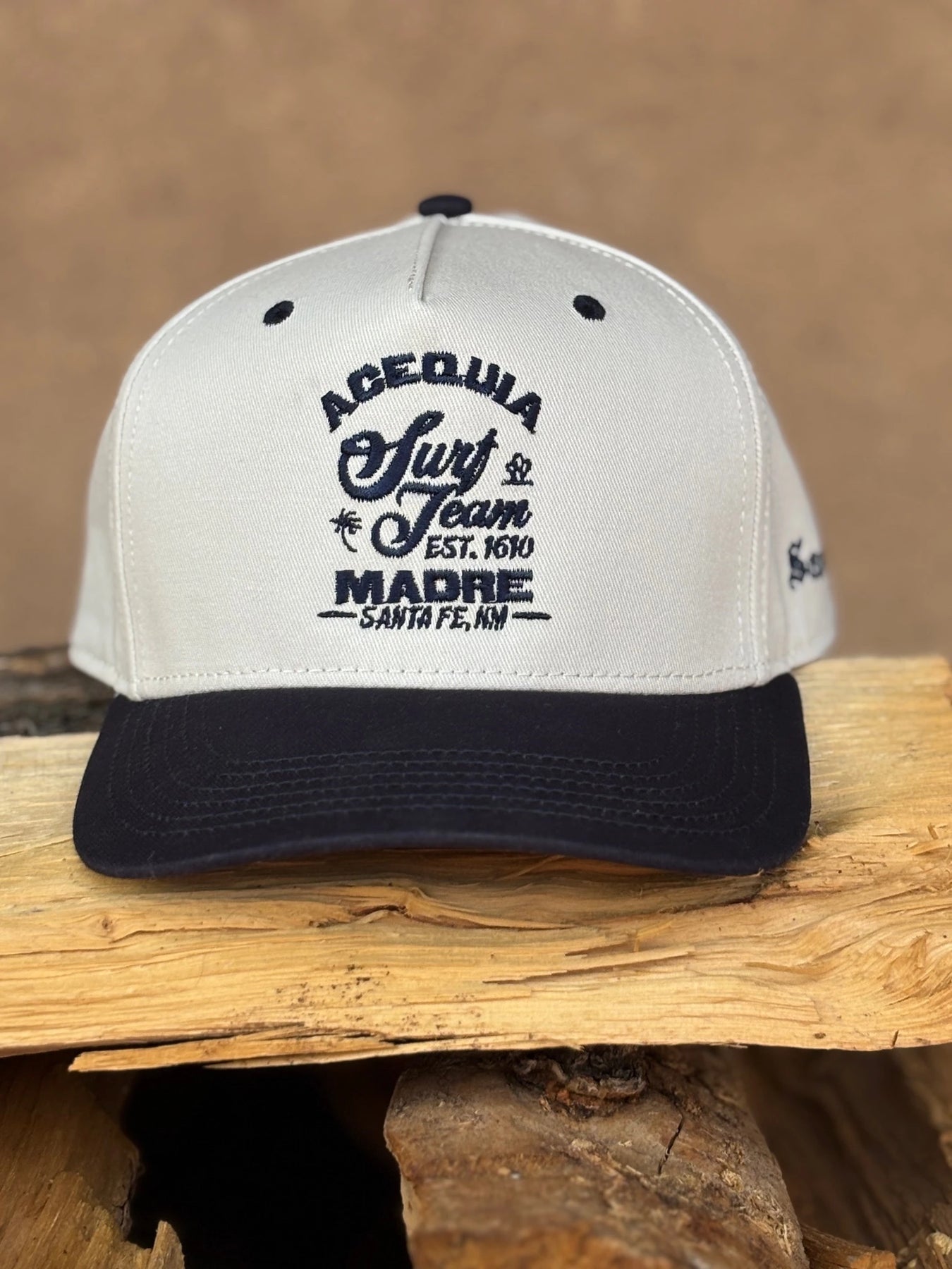 These heritage twill caps with our Acequia Madre Surf Team logo will be sure to turn heads.