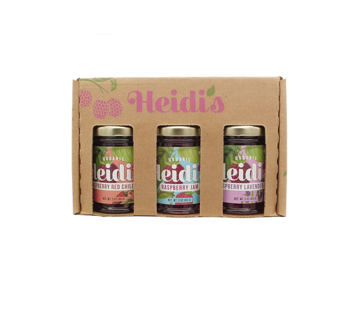 This sampler set includes 3 of our favorite Heidi's Organic Raspberry jams in our 3 oz. size. Packaged in our custom Heidi’s box, this set makes an amazing gift or a great way to try multiple flavors.