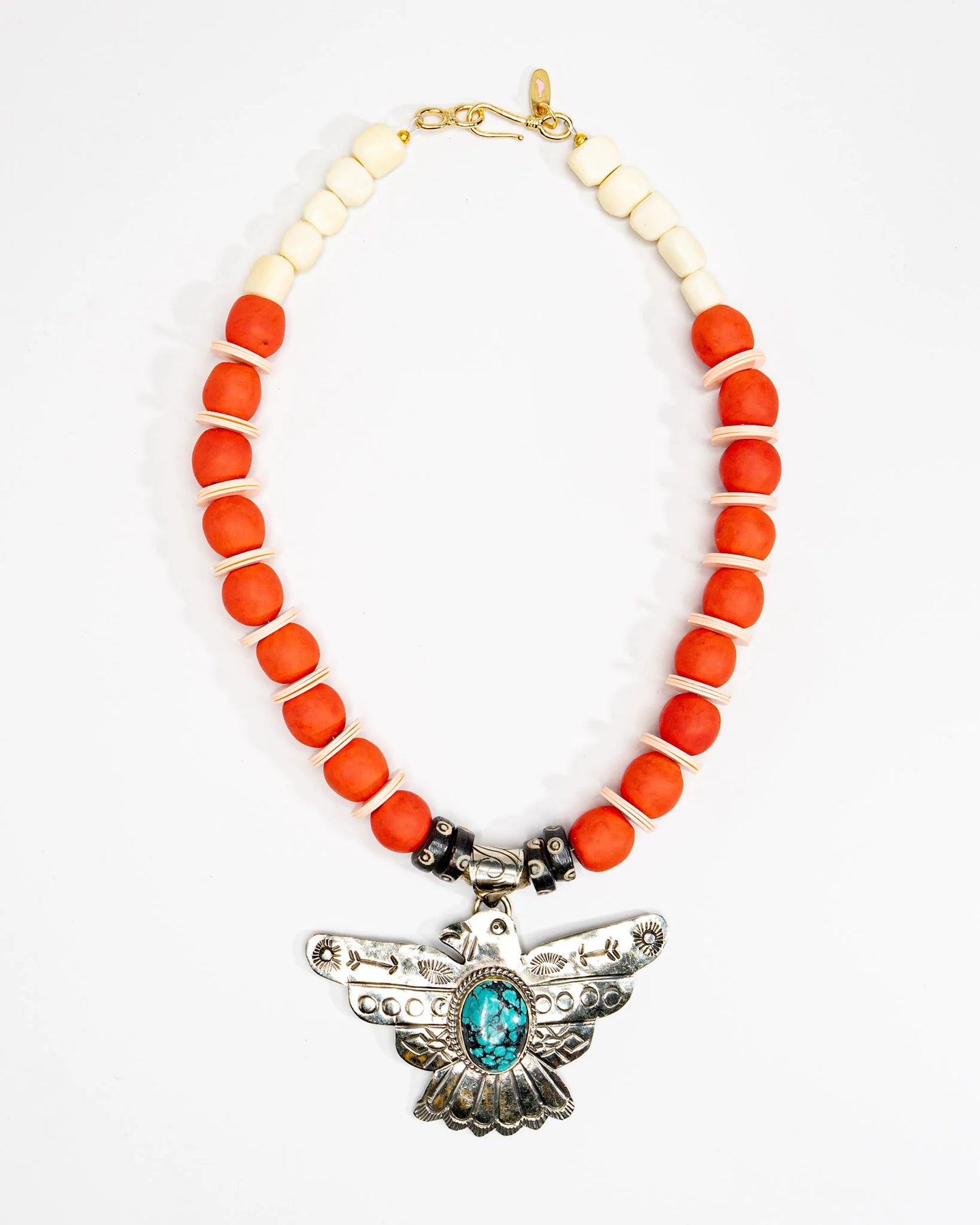 Metal Thunderbird with turquoise stone mixed with poppy colored African clay, pink African vinyl and carved wood.